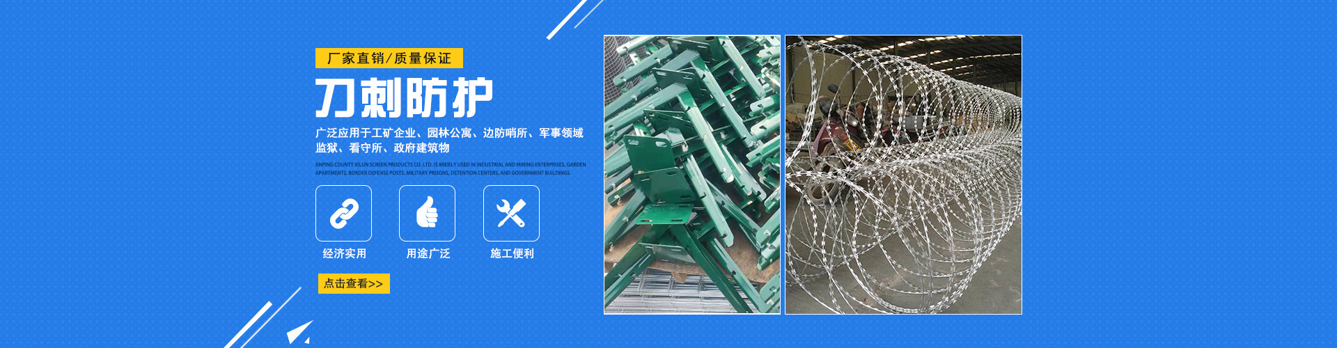 安平初日絲網(wǎng)有限公司是一家專業(yè)的絲網(wǎng)生產(chǎn)銷售廠家,主要產(chǎn)品有刀片刺繩、刺絲滾籠、刺繩支架等產(chǎn)品,公司為客戶提供產(chǎn)品知識(shí)和新鮮是市場(chǎng)行情,回答用戶產(chǎn)品相關(guān)問題,幫助用戶更好的選購(gòu)產(chǎn)品。